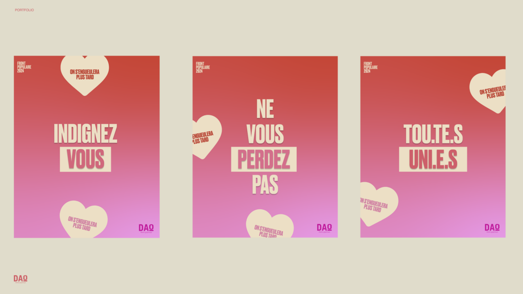 - Travail sur une typographie impactante, des messages clairs et des codes visuels lisibles par tous·tes.